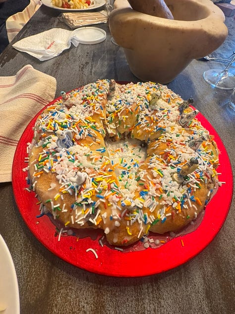 For some fool hardy years ( 9 now) a small band of North Americans have gathered on the day in Nérac to chow down on a well made Muffaletta sandwich courtesy of Gumbo Willy and a Kings Cake from me. This year the newest members of the Nérac Posse Krewe brought macaroni salad, planters’ punch, and pancakes- it is Shrove Tuesday after all.