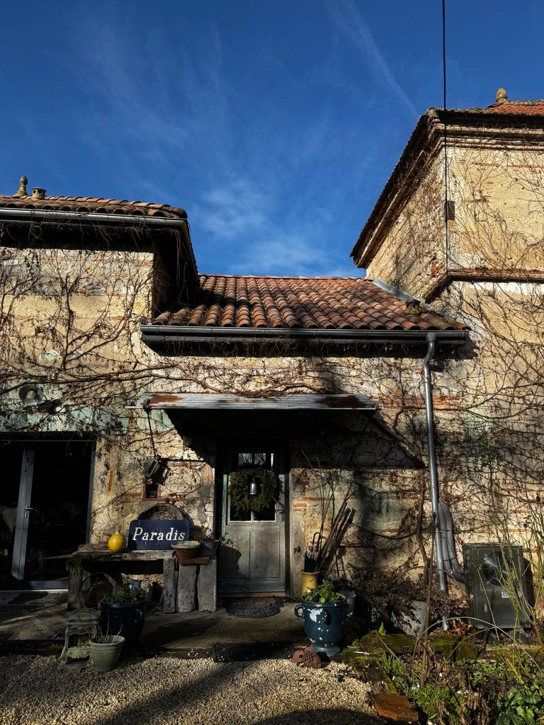 Grateful for a full morning of French sunshine after weeks and weeks of rain and flooding. But where to begin but the beginning—the opening into the light, the welcome to my house, the front door, the first things I see when I drive in. Yes, I claim it as Paradis.