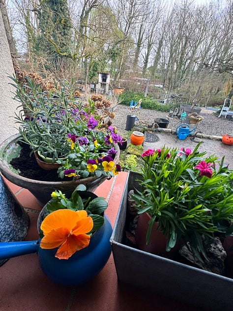 I spent the morning planting pots of late tulip bulbs (yes, they will sprout and flower!) and terracotta window boxes of pansies to place at the front door long ago stained with copper sulfate powder. There are herbs and flowers mixed in the kitchen window garden as a way to invite Spring inside, even when I am still lighting a woodfire in the evening. Where to begin? At the beginning…
