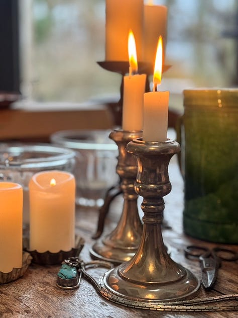 Grey mornings all week and more breakfast candles to light the way. I am focusing on how I look in and out at the daylight and how that affects all I do. The kitchen needs more light these months and so I’ll steal a little table lamp and put it on a counter. Why Not?